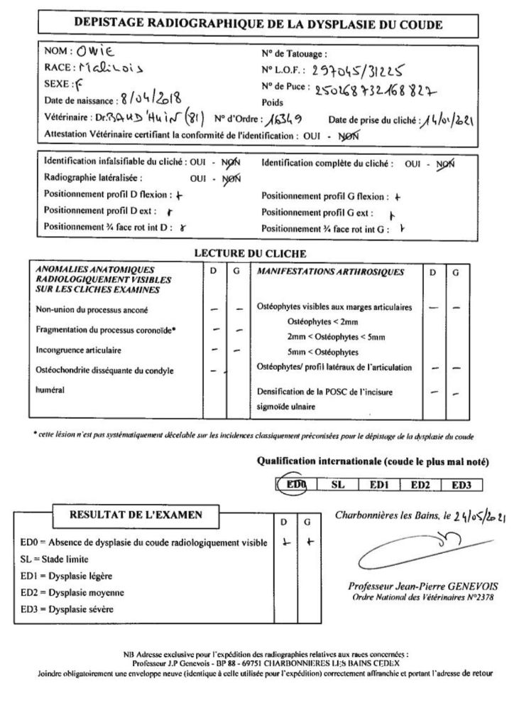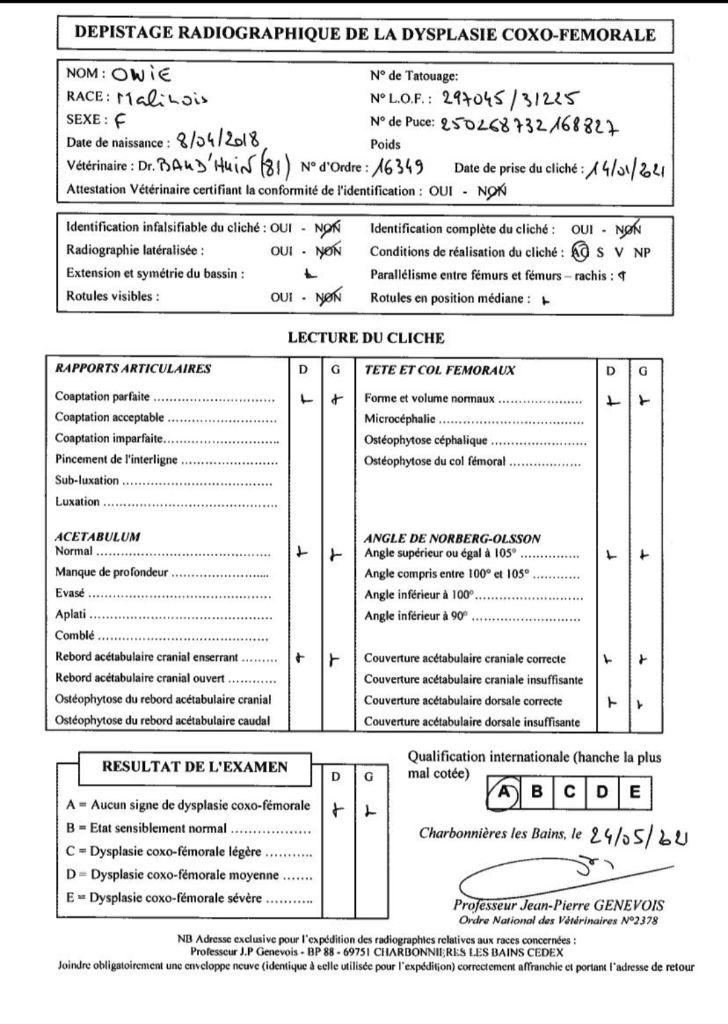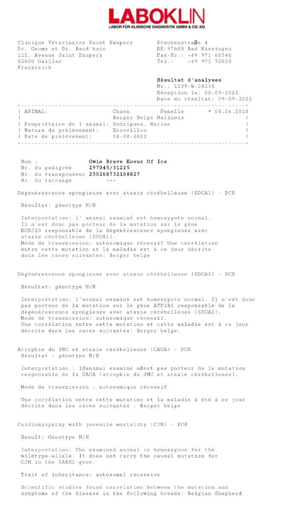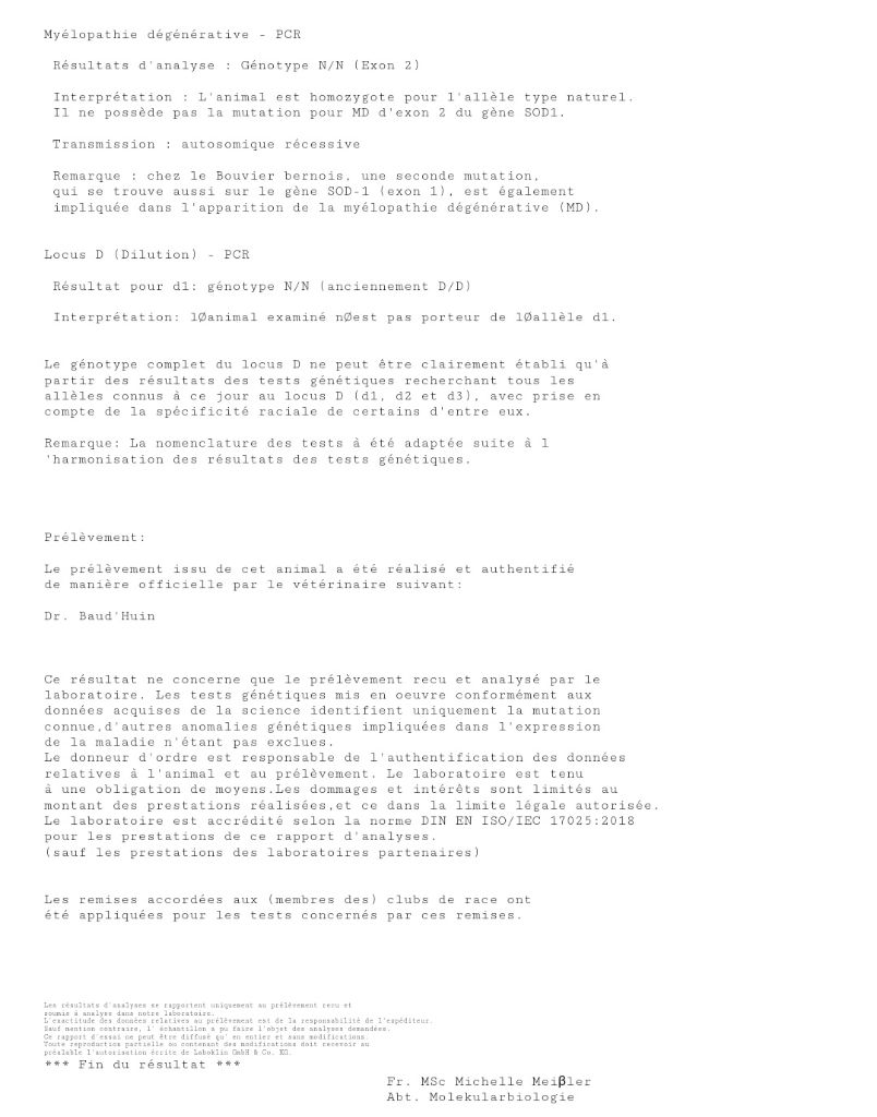 CA1 (ataxie dégénérative) : N/N Caca/ca4 - atrophie Snc : Free Cardiomyopathie juvénille mortelle : Free Coudes : ED-0 Dilution - gene poils bleu : Free Hanches : HD-A LTV : Free - 0 Myelopathie dégénérative : Free Poils longs : Free N/N Poils longs : N/N Free Radios Coudes : ED-0 Radios Hanches : HD-A SDCA 1 : Free SDCA 2 : Free Spondylose : Free - 0 |