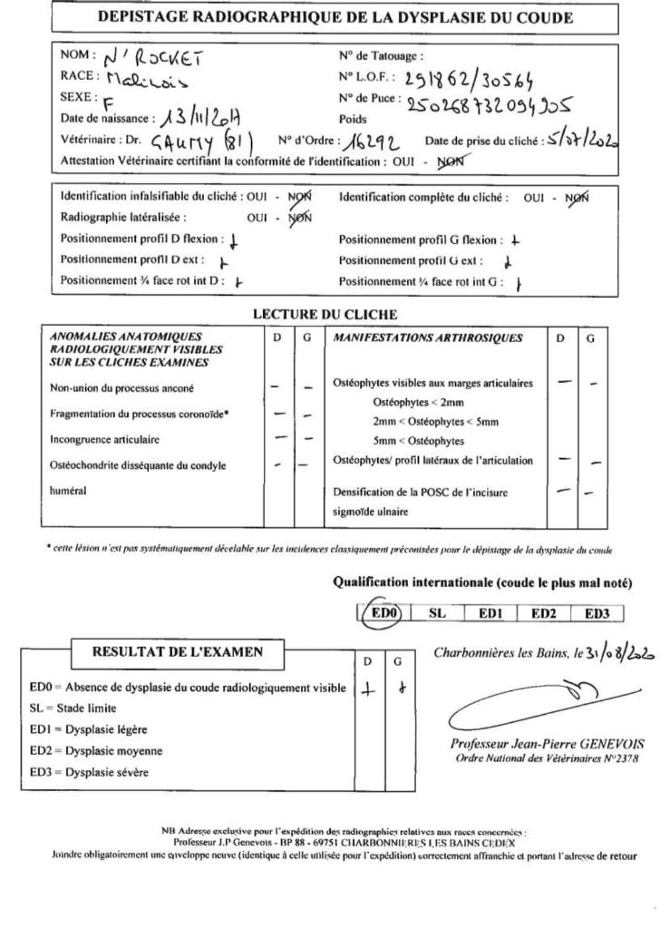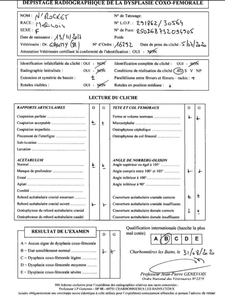 Adn : Disponible Caca/ca4 - atrophie Snc : Free N/N Cardiomyopathie juvénille mortelle : Free N/N Coudes : ED-0 Dilution - gene poils bleu : Free N/N Hanches : HD-B Lombosacral : Free - 0 Mielopathie dégénérative MD : Free Poils longs : N/N Sdca-1 : Free Sdca-2 : Free Spondylose : Free - 0 |